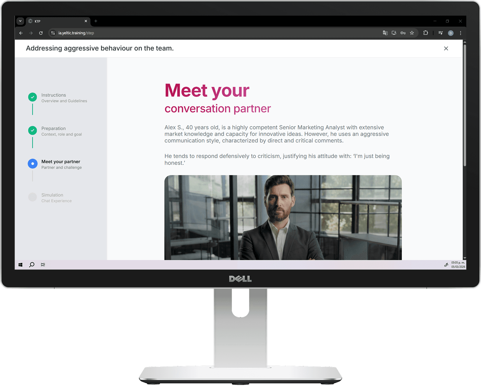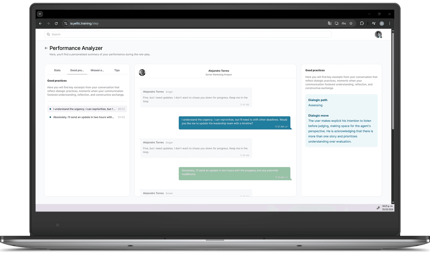 Yeltic Dialogue ofrece entrenamiento experiencial habilitado por tecnología, diseñado para desarrollar capacidades dialógicas medibles. Los usuarios participan en prácticas conversacionales estructuradas basadas en escenarios, con retroalimentación impulsada por IA y seguimiento progresivo del desarrollo de habilidades.
